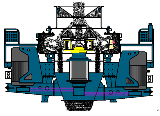 基本工作原理與中心進(jìn)料伴隨瀑落料”石打石“相同,不同的是完全中心進(jìn)料時(shí)將散料錐卸掉,石料全部從進(jìn)料口直接落入分料盤中,經(jīng)分料盤中間直接落入粉料盤中,經(jīng)粉料盤中間直接進(jìn)入甩輪中。